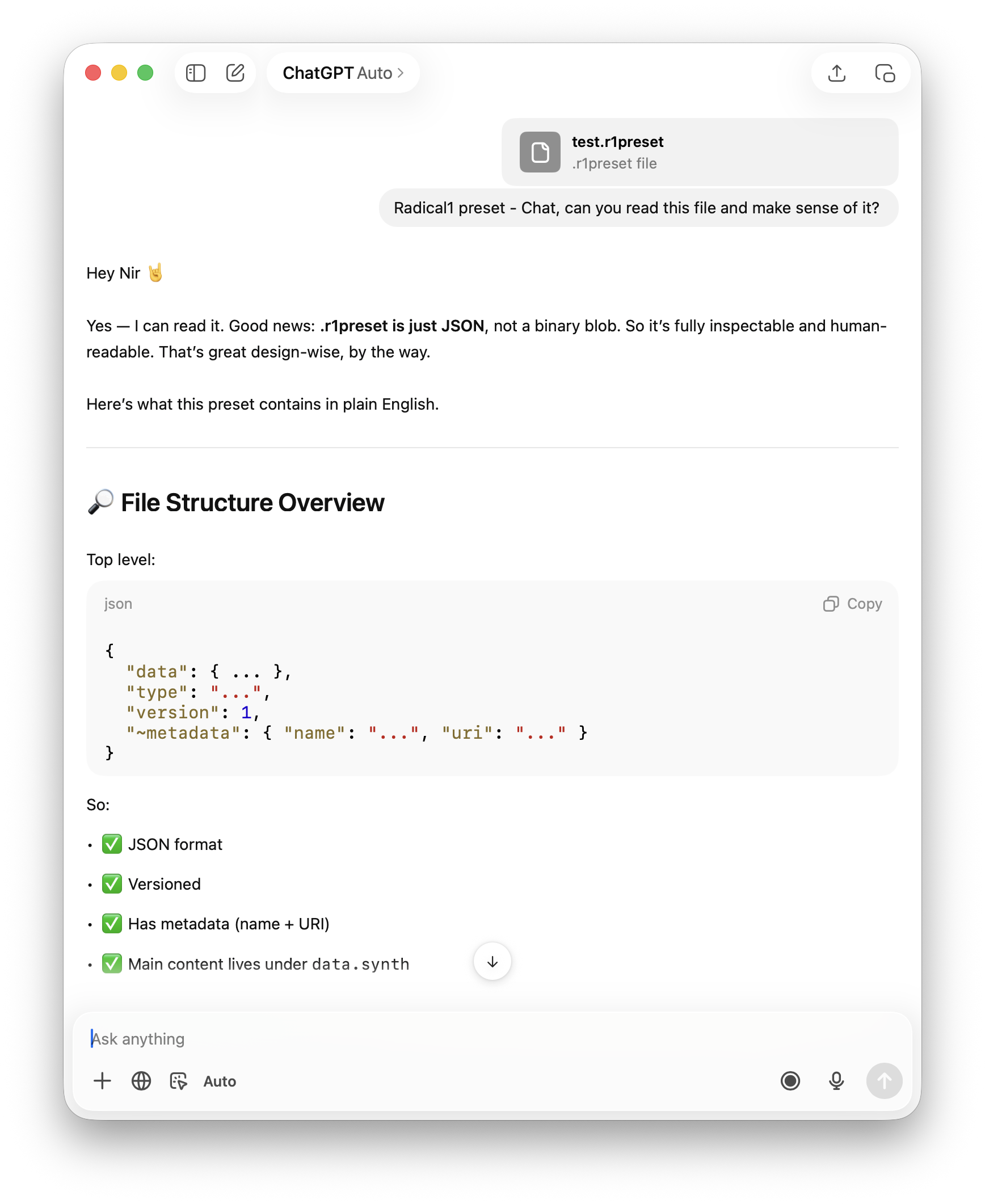 This allowed the AI to inspect the JSON and understand how Radical1 organizes its data. Instead of guessing the format, the AI could learn directly from a valid synthesizer preset structure.